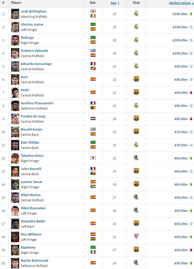 Найдорожчим гравцем Ла Ліги є півзахисник Реала Джуд Беллінгем — 180 млн євро, а за ним ще чотири гравці "вершкових".