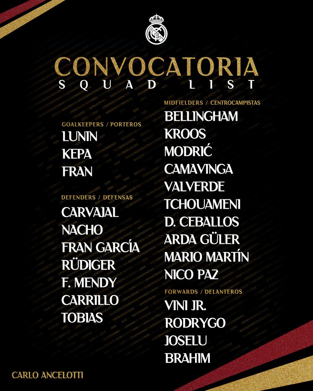 У заявку "вершкових" потрапили 24 футболісти, на яких зможе розраховувати головний тренер Реала Карло Анчелотті.