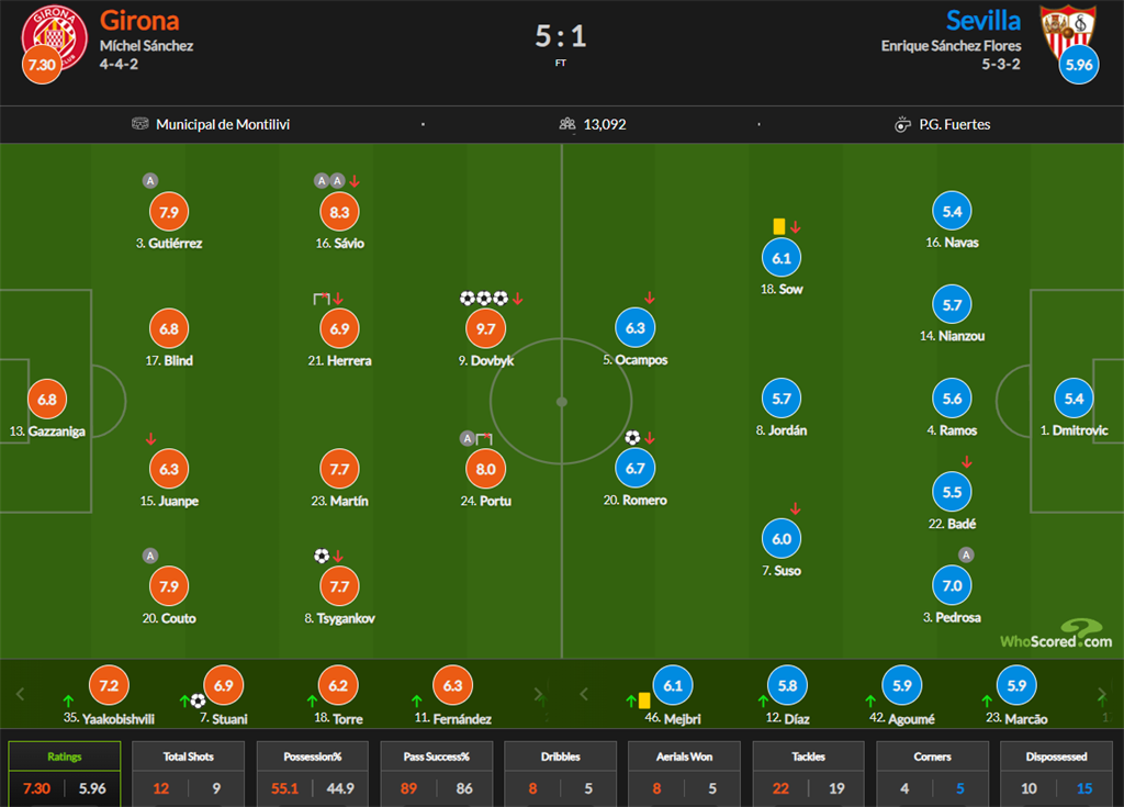 Від WhoScored 26-річний гравець Жирони отримав оцінку 9.7 балів, тоді як у правого півзахисника Віктора Циганкова — 7.7 балів.