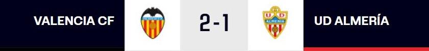 - Валенсія мінімально виграла в міцної Альмерії (2:1). У другому таймі Пепелу не реалізував пенальті, а Роман Яремчук відзначився вирішальним голом.