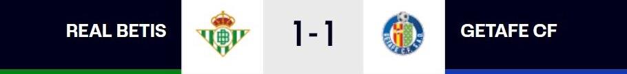 - Бетіс та Хетафе зіграли результативну нічию (1:1). Команди забили по голу у першому таймі.
