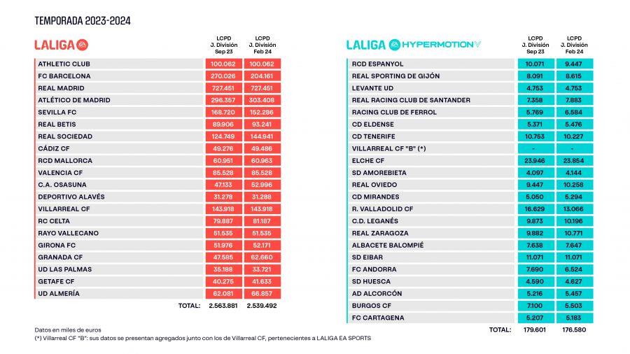Річний ліміт витрат Барселони було скорочено ще на 66 млн євро — з 270 до 204. Реал зберігає найвищий показник, а саме 727 млн. Другим іде Атлетіко (303 млн). Найгірший показник у Ла Лізі в Алавеса — 31 мільйон євро.
