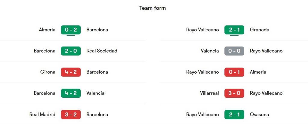 Баланс наразі складає 32 матчі, 20 перемог Барселони, 6 нічиїх і 6 тріумфів Райо Вальєкано.