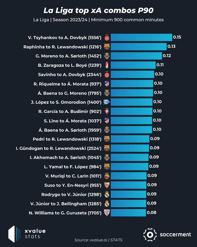 Статистичний портал Soccerment представив рейтинг найкращих дуетів іспанської Ла Ліги за очікуваними гольовими передачами один на одного за 90 хвилин матчу.