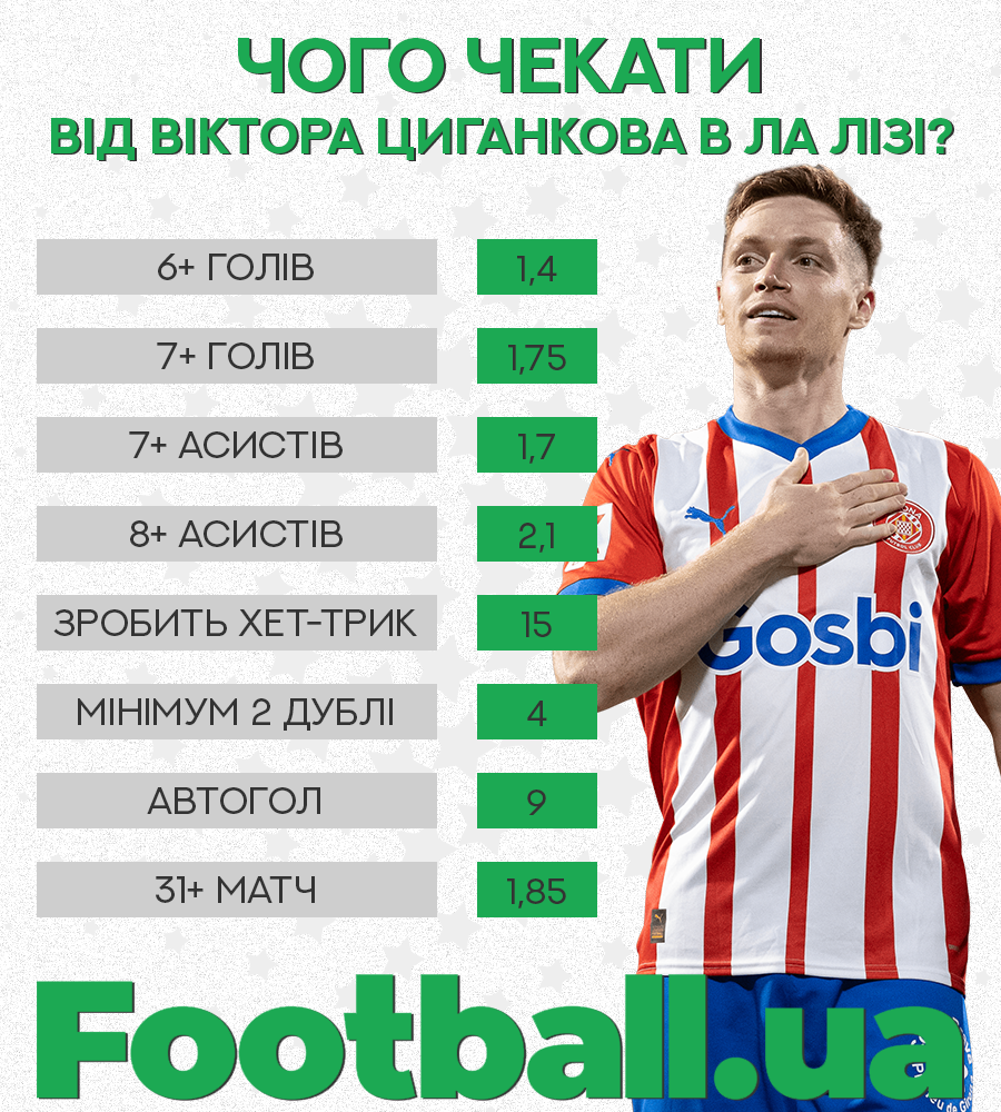 Віктор Циганков провів дуже вдалий сезон у Жироні, як і команда в цілому. Український вінгер привернув увагу декількох клубів, але залишився в поточній команді. Тренерський штаб та вболівальники покладають великі надії на гравця, який вже відзначився голом та результативною передачею. Отже, пропонуємо вам дізнатися котирування букмекерів на дії українця.