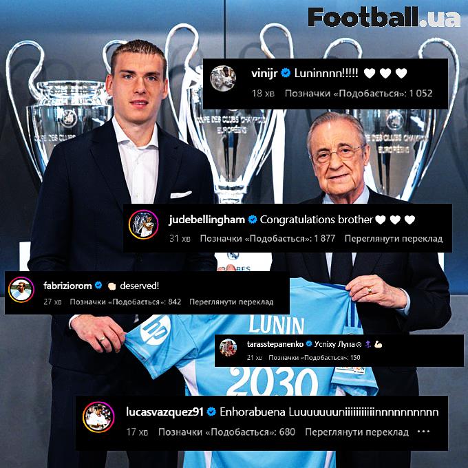 Так, зокрема, свої привітання залишили лідери "вершкових" Вінісіус Жуніор, Джуд Беллінгем і Лукас Васкес, а також досвідчений опорний півзахисник збірної України Тарас Степаненко разом із відомим журналістом Фабріціо Романо.
