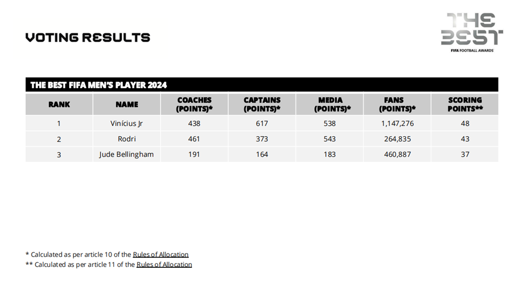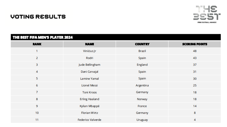 За підсумками голосування, 24-річний Вінісіус набрав 48 балів, випередивши центрального півзахисника Манчестер Сіті Родрі (43 бали), свого одноклубника Джуда Беллінгема (37 балів) та інших вісім конкурентів.