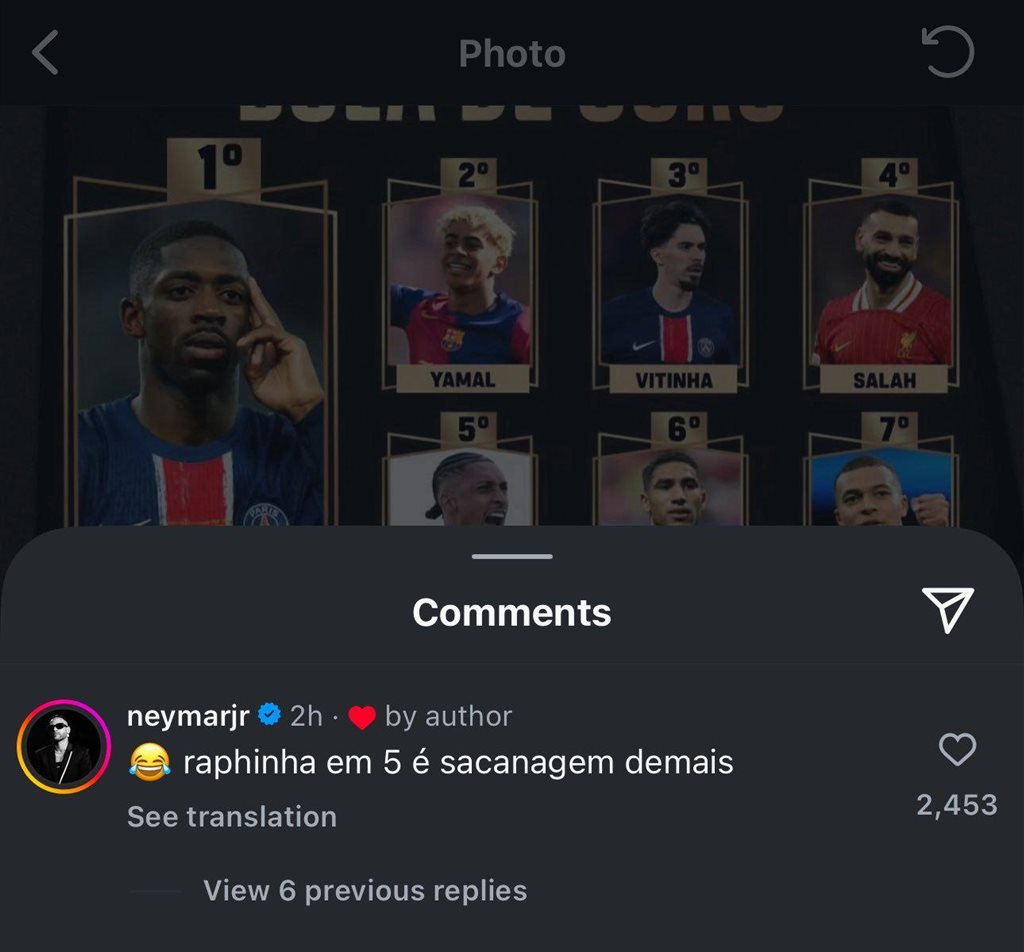 Під постом з результатами голосування Неймар коротко написав: "Рафінья п'ятий? Це занадто сильний жарт".