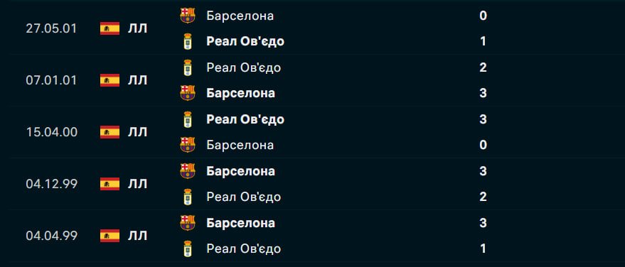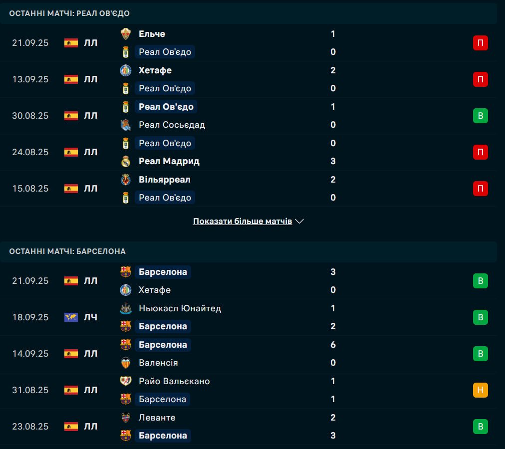 Голи даються Овьєдо важко: лише один забитий м’яч після п’яти турів — найгірший показник у лізі. Команда посідає 17-те місце, перебуваючи лише на одне очко вище зони вильоту. Проте проти Барселони “сині” історично забивали регулярно, відзначившись у кожному з останніх 12 матчів Ла Ліги проти каталонців, загалом забивши 19 голів — найкращий показник проти цього суперника в статусі команди еліти. Реал Овьєдо вважається явним аутсайдером, але їхня остання перемога над Барселоною в Ла Лізі (1:0 на виїзді) датована травнем 2001 року, і вони прагнутимуть повторити успіх, здобувши дві поспіль перемоги над каталонцями вперше з квітня 1961 року.