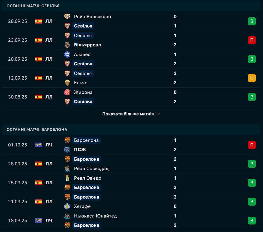 Барселона, у свою чергу, прагне відновитися після прикрої поразки 1:2 від ПСЖ у Лізі чемпіонів у середу, де чинний європейський чемпіон здобув сенсаційну перемогу на полі каталонців. У Ла Лізі команда Гансі Фліка набрала 19 очок у семи матчах. Барселона здобула перемогу 2:1 над Реал Сосьєдадом минулого вікенду, а єдина втрата очок у чемпіонаті сталася у виїзному матчі проти Райо Вальєкано перед вересневою міжнародною паузою. Каталонці перебувають у чудовій формі, вигравши сім останніх матчів проти Севільї в Ла Лізі, включно з розгромами 5:1 і 4:1 минулого сезону.