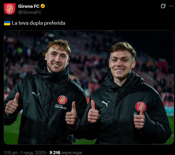 Після матчу офіційний акаунт Жирони в соцмережі X опублікував спільне фото українців з наступним підписом: "Ваш улюблений дует".