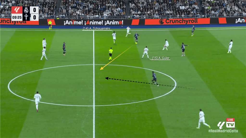 Так, у виїзному матчі проти Атлетіка Більбао, який охоче пресингував високо, у центрі поля з'являлися вільні зони, якими могли скористатися силові бокс-ту-бокс півзахисники Реала. У парі з Беллінгемом і Вальверде Чуамені й Камавінга цементували центр поля, перекривали зони, вигравали другі м'ячі та утримували команду в атакувальному режимі.