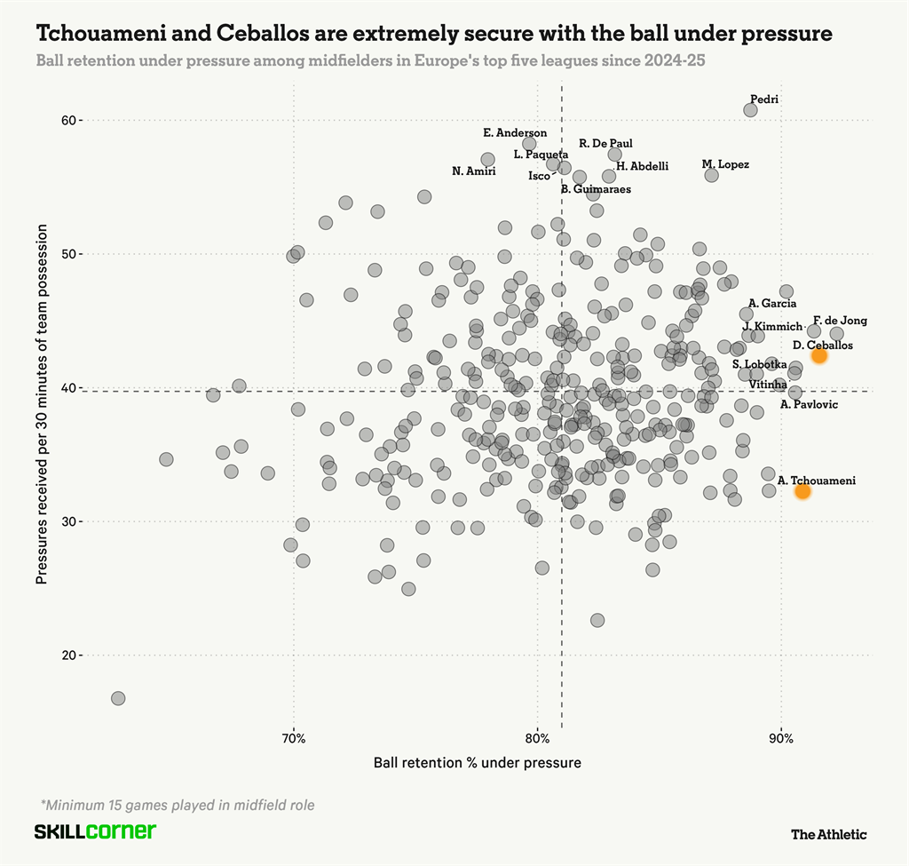 За даними SkillCorner, француз є одним із найкращих у команді за вмінням зберігати м'яч під тиском. Як видно нижче, Дані Себальйос теж має високі показники, але іспанець не завжди достатньо швидко просуває м'яч уперед і не володіє потрібною фізикою, щоб стабільно закривати настільки вимогливу оборонну роль. У клубі відчувається нестача гравця типу Крооса, але знайти поєднання стійкості до пресингу з умінням швидко й точно розподіляти м'яч на великі дистанції — завдання надзвичайно складне.