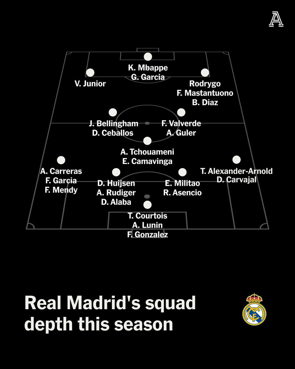 Проблема Реала на флангах атаки зводиться до одного й того ж: усі основні гравці атаки — Вінісіус Жуніор, Родріго й Кіліан Мбаппе — надають перевагу грі зліва. Мбаппе з часом усе більше закріпився в ролі центрального нападника, ротаційно діючи на позиції дев'ятки — і робить це з нищівною ефективністю. Водночас питання майбутнього Вінісіуса Жуніора залишаються відкритими. Не менш невизначеною є й ситуація з Родріго — гравцем, якого зазвичай зсувають праворуч, аби додати балансу трійці попереду.