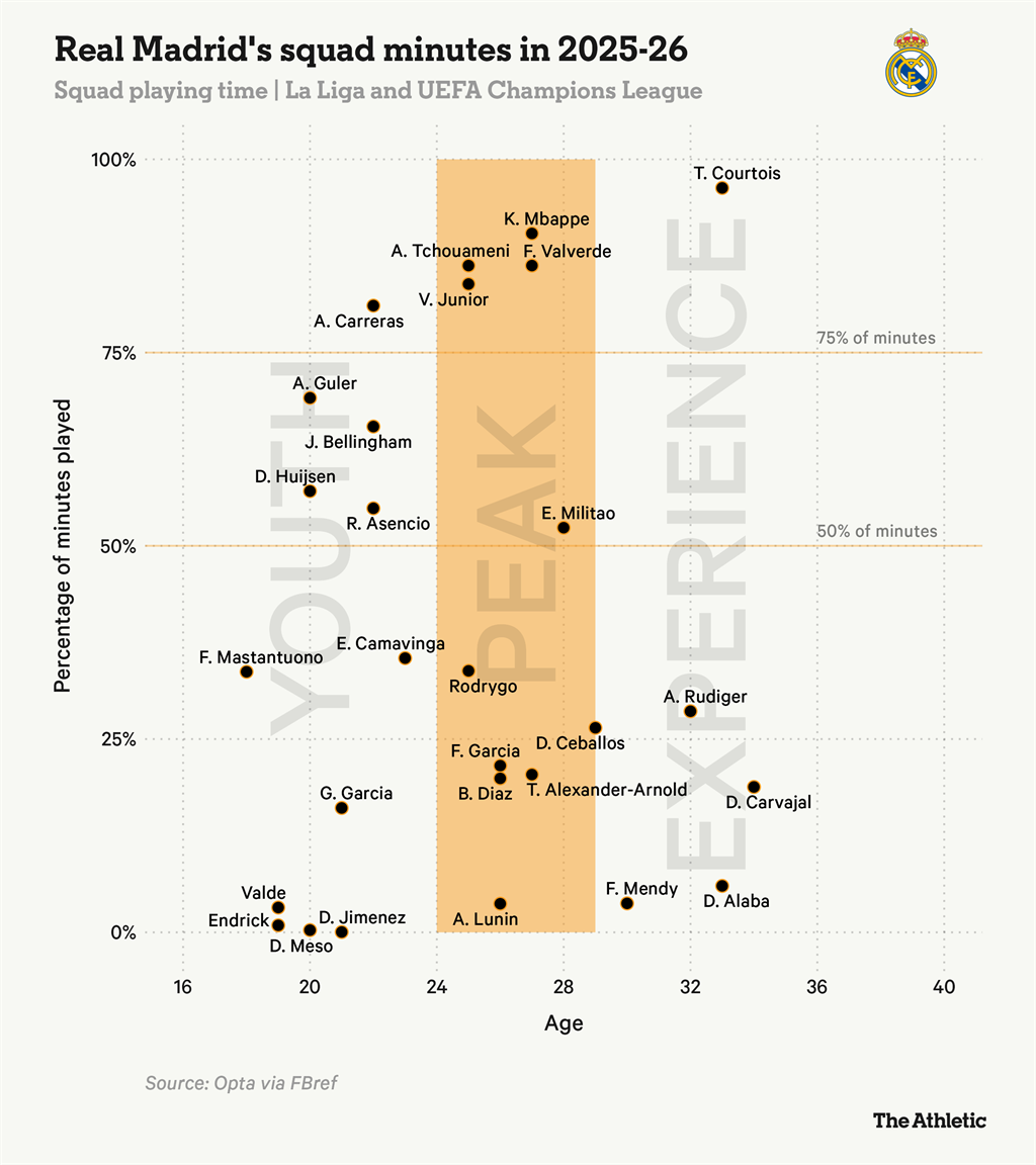 Цього сезону Реалу так і не вдалося сформувати стабільну четвірку захисників — передусім через травми в центрі оборони та на правому фланзі. Як видно з графіка нижче, лише лівий захисник Альваро Каррерас відіграв понад 75% від можливого ігрового часу, тоді як ані Александер-Арнольд, ані Карвахаль не набрали й 500 хвилин у всіх турнірах.