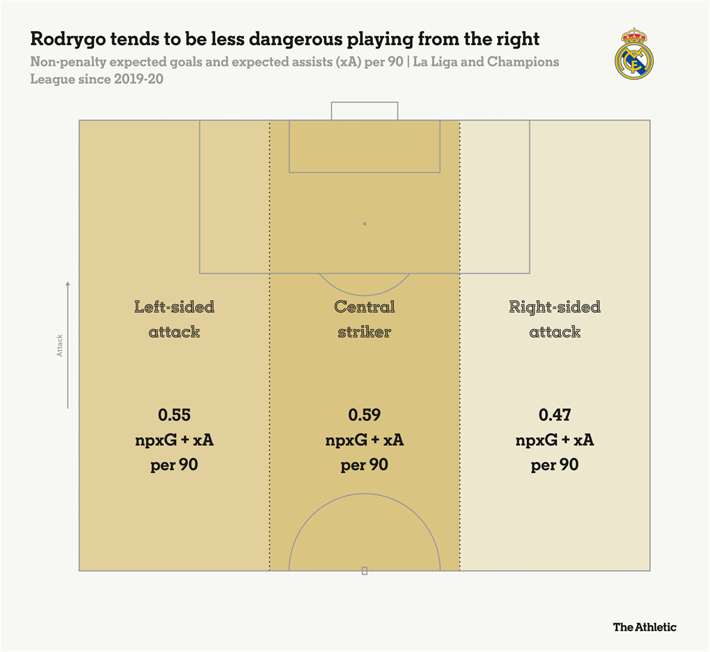 Як свідчить графік нижче, Родріго протягом усієї кар'єри в Реалі виглядав значно активнішим саме з лівого флангу, створюючи більше сумарних очікуваних голів не з пенальті (npxG) і асистів (xA) за 90 хвилин, а також значно частіше йшов у обіграші один в один — 7,4 проти 4,2 за 90 хвилин. Це наштовхує на висновок, що в разі відходу Вінісіуса Жуніора Реал цілком може знайти його заміну всередині наявного складу.