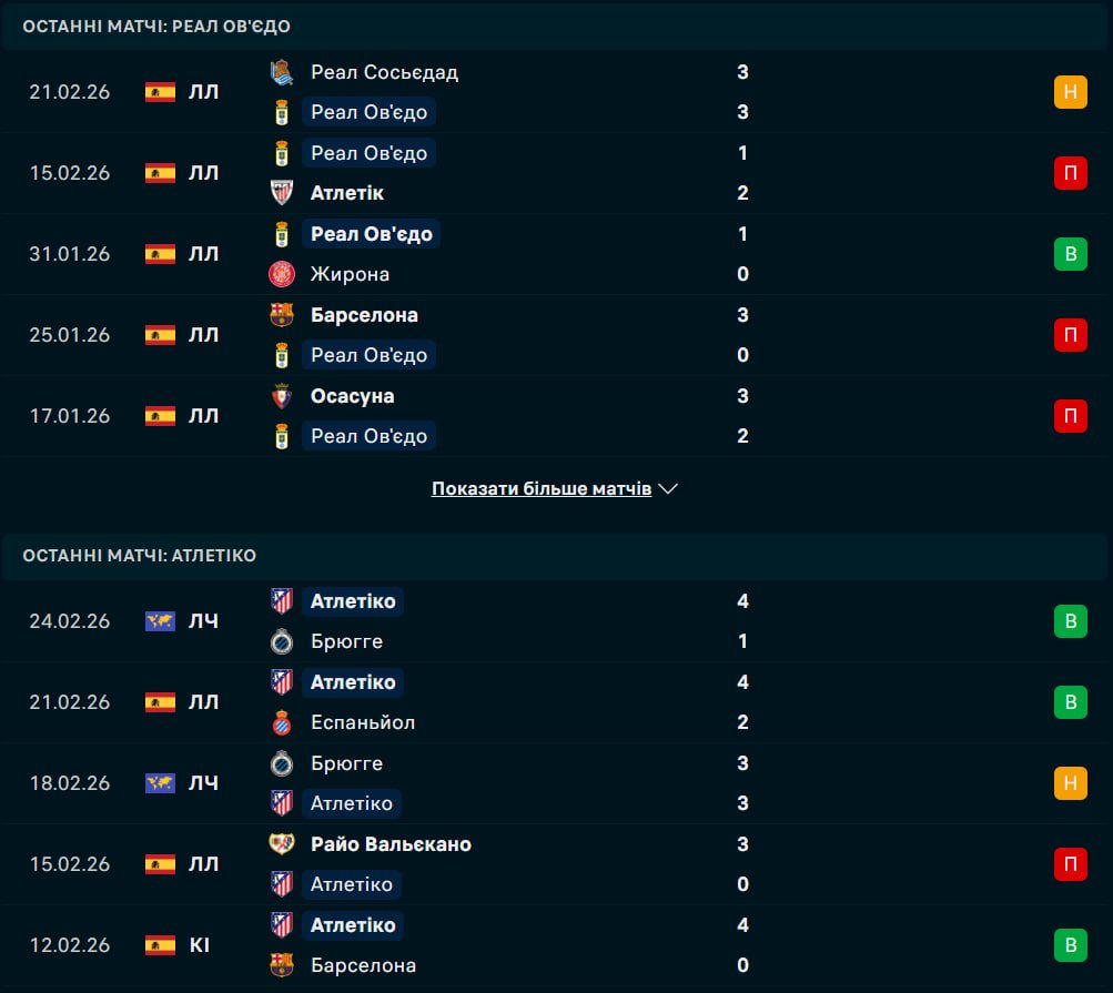 Реал Ов'єдо підходить до цієї гри після результативної нічиєї з Реал Сосьєдад (3:3). Команда Гільєрмо Альмади вела в рахунку наприкінці матчу, але в підсумку врятувалася лише на останніх хвилинах завдяки голу Еріка Баї. Попри бойовий настрій, ситуація "синіх" залишається критичною: вони набрали лише 17 очок у 24 турах і відстають від рятівного 17-го місця на вісім балів. Головною проблемою астурійців є атака — лише 16 забитих м'ячів у сезоні. До того ж Ов'єдо має одну з найгірших домашніх статистик у лізі, набравши лише 11 очок у 12 іграх.