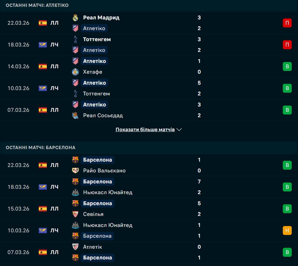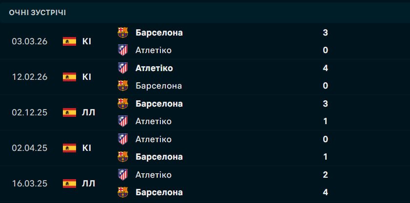 Барселона Гансі Фліка продовжує лідирувати в Прімері, випереджаючи Реал на чотири пункти. Каталонці не програють уже вісім матчів поспіль і напередодні міжнародної паузи мінімально здолали Райо Вальєкано. Хоча "блаугранас" виграли чотири з останніх п'яти очних зустрічей із Атлетіко (включаючи 3:1 у першому колі сезону-2025/26), вони традиційно обережні на виїзді, де зазнали всіх чотирьох своїх поразок у поточному чемпіонаті. Перемога в Мадриді дозволить Барселоні зберегти безпечну дистанцію від "вершкових" перед фінальним відрізком сезону.
