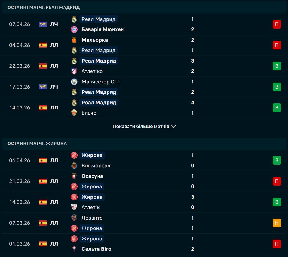 Реал Мадрид переживає один із найскладніших відрізків у сезоні. Несподівана осічка в матчі з Мальоркою (1:2) минулого вікенду завдала важкого удару по чемпіонських амбіціях "вершкових". Щоб сподіватися на диво, мадридцям необхідно вигравати всі вісім матчів, що залишилися. Ситуацію ускладнює поразка від Баварії (1:2) у першій чвертьфінальній грі ЛЧ. Попри те, що основні думки Арбелоа та гравців уже в Мюнхені, "бланкос" зобов'язані брати три очки проти Жирони, аби остаточно не випасти з гонки за титул. Домашня статистика на боці господарів — 13 перемог у 15 зустрічах, проте нічия 1:1 у першому колі нагадує про непоступливість каталонців.