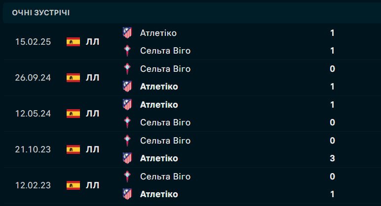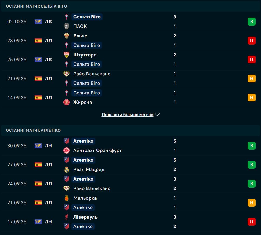 Сельта Віго досі не здобула жодної перемоги в Ла Лізі сезону-2025/26, набравши п’ять очок за сім турів завдяки п’яти нічиїм і двом поразкам, що залишає їх на 17-му місці в турнірній таблиці. Усі п’ять нічиїх “небесно-блакитних” завершилися з рахунком 1:1, а минулого вікенду вони зазнали поразки 1:2 від Ельче в чемпіонаті. Проте в Лізі Європи команда Клаудіо Гіральдеса відкрила рахунок перемогам у новому сезоні, обігравши ПАОК 2:1 на домашньому полі в четвер, що може додати впевненості перед зустріччю з Атлетіко. Минулого сезону Сельта фінішувала сьомою в Ла Лізі, забезпечивши собі місце в Лізі Європи, але нинішній старт виявився складним. У лютому 2025 року Сельта зіграла внічию 1:1 з Атлетіко, але їхня остання перемога над мадридцями датована вереснем 2018 року, коли “небесно-блакитні” виграли 2:0 на своєму полі.