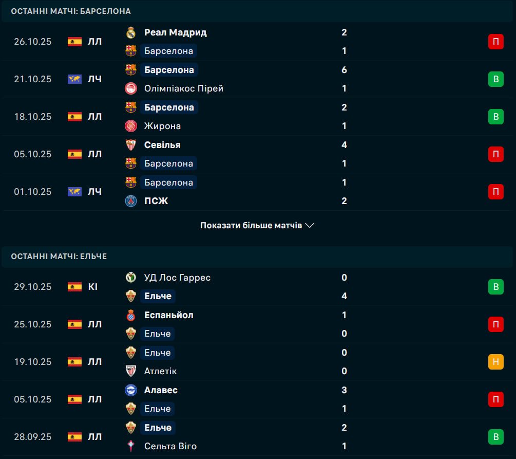 Ельче виступає вище очікувань цього сезону після виходу з Сегунди. 14 очок у 10 матчах дозволяють їм посідати високе восьме місце. Їхній рекорд: три перемоги, п'ять нічиїх та дві поразки. Команда Едера Сарабії підходить до цього матчу після переконливої перемоги 4:0 над УД Лос Гаррес у Кубку Іспанії, але в чемпіонаті вони програли 0:1 Еспаньйолу минулого вікенду. Ельче виграв лише один із останніх п'яти матчів ліги і досі не здобув жодної перемоги на виїзді в цьому сезоні (три нічиї та дві поразки). У неділю вони боротимуться за історичну першу перемогу на виїзді над Барселоною.