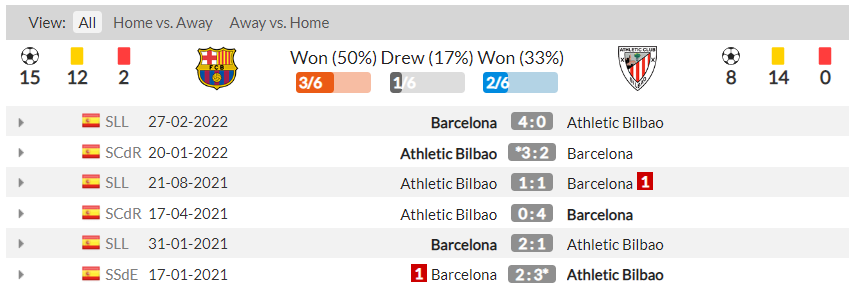 — востаннє Атлетік перемагав на Камп Ноу ще в сезоні-2001/02 (2:1), після чого команди зустрілись уже 20 разів, а баски лише тричі зуміли зачепитись бодай за один бал Останнього разу це було в 2018 році (1:1).