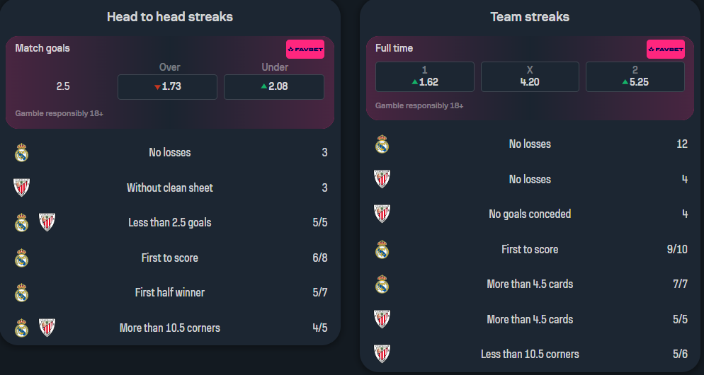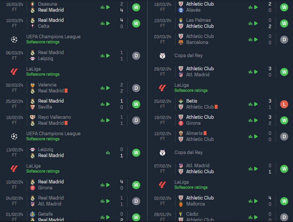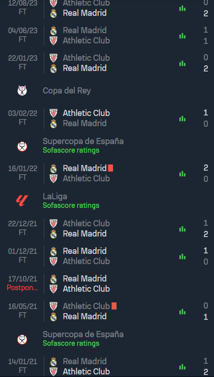 Якщо говорити про особисті зустрічі, то команди зіграли між собою 243 матчі, із яких Реал виграв 122, а Атлетік — 76, нічию зафіксовано 45 рази. Статистика забитих м'ячів також на користь "бланкос" — 457:328.