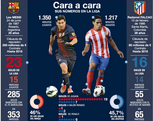 Месси против Фалькао: на двоих два потрясающих бомбардира забили в текущем испанском чемпионате 38 мячей – больше, чем любая команда Ла Лиги, кроме Барселоны.