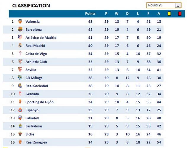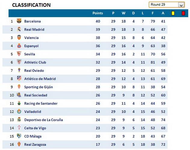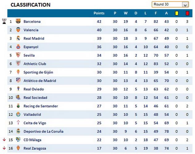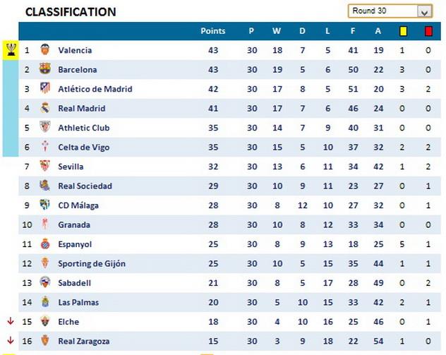 Три команды претендовали на золотые медали перед хорнадой №30, впрочем, шансы Валенсии оценивались как микроскопические, так как любой набор очков Барсы и Мадрида оставил бы ее не у дел – Летучие мыши проигрывали бланкос по сумме личных встреч, а Барсе – по общей разнице мячей при равенстве в очных поединках. Валенсия сумела обыграть в гостях вылетающую Сарагосу 2:0, но самым главным событием тура должны были стать встречи двух других претендентов на золото.