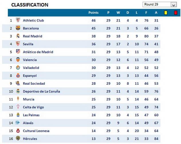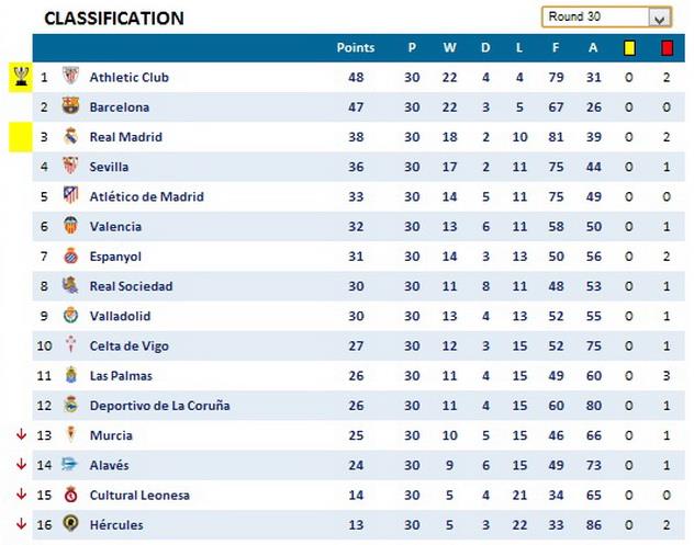 Со своей задачей каталонцы справились – гол Луиса Суареса позволил им в гостях обыграть Леонесу, но и Атлетик уверенно победил на своем поле Вальядолид – 3:0 (Гаинса, Ариета, Марсаида), завоевав, таким образом, золотые медали испанского национального первенства.