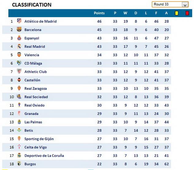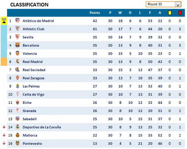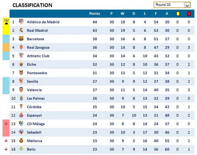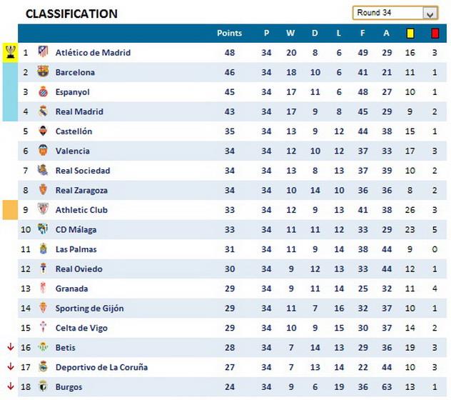 Накануне 30-го тура Атлети опережал своих кровных врагов на одно очко, но расслабляться Матрасникам было нельзя – в случае итогового равенства баллов чемпионом становился бы Мадрид, имевший преимущество над красно-белыми в личных встречах (1:1, 3:1). Бланкос разгромили прощавшуюся с Примерой Мальорку со счетом 5:1 – дубли Хенто и Гроссо, гол Амансио. Атлетико же предстоял выезд к Эспаньолу, где парни Доменека Балманьи решили исход поединка в течение 56 секунд в концовке первого тайма, благодаря усилиям Хорхе Гриффы и Хосе Уфарте.