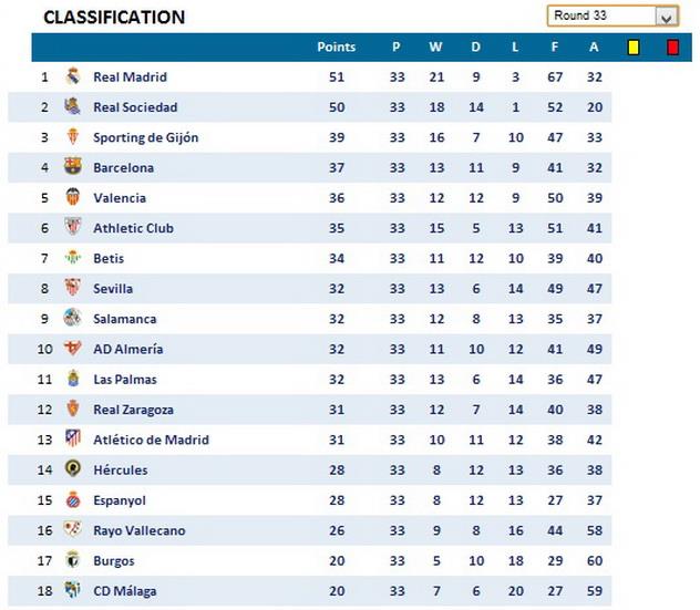 Никто не мог составить конкуренцию ушедшему в отрыв Мадриду серба Вуядина Бошкова – кроме сенсационного Сосьедада, ставшего главным открытием сезона. Оставив всех остальных далеко позади, два Реала выясняли отношения между собой, причем, баски имели преимущество в личных встречах (4:0 и 2:2).