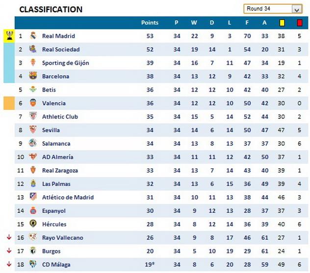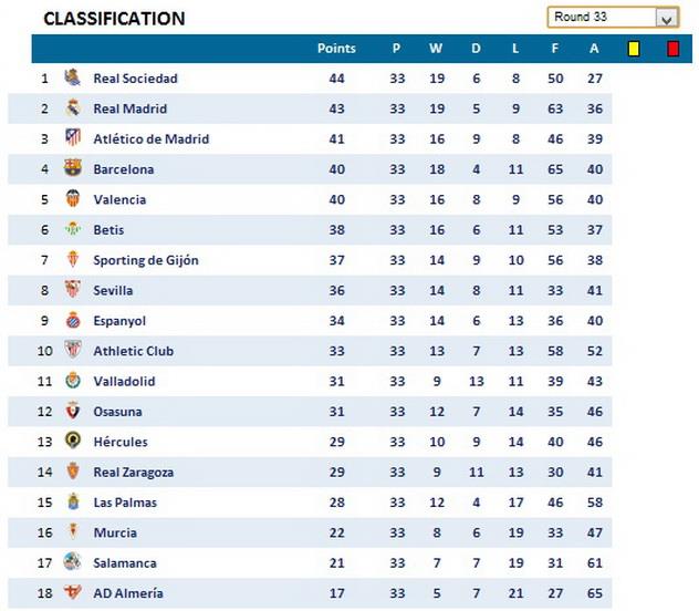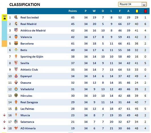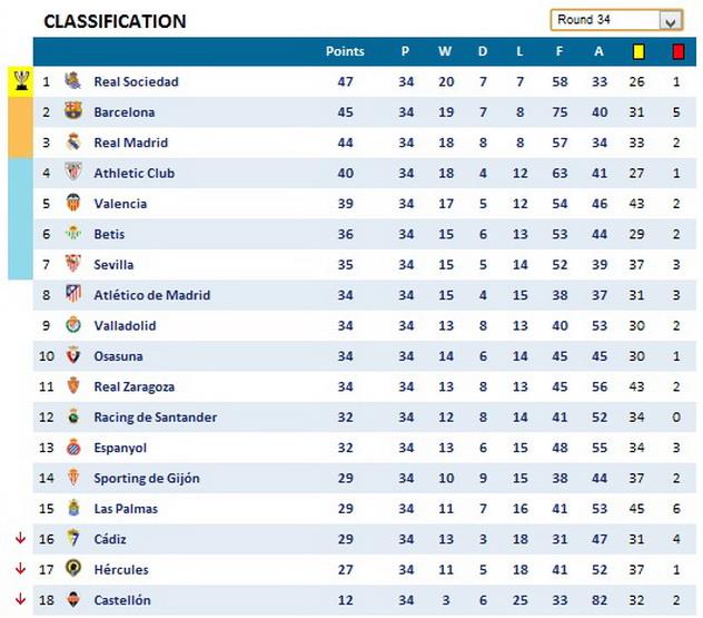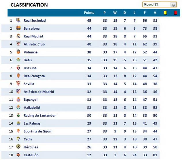 Практически повторилась драматургия предыдущего испанского первенства – вновь Мадрид и Сосьедад оказались во главе пелетона перед последним туром. Баски опережали столичный клуб на одно очко, имели худшую разницу забитых и пропущенных мячей, зато на их стороне было преимущество в личных встречах (0:1 и 3:1). То есть, баскскую команду устраивала в 34-м туре и ничья.