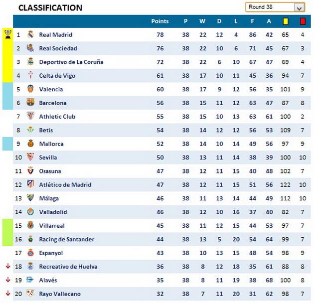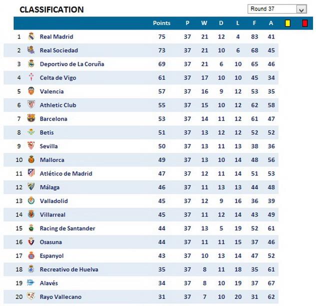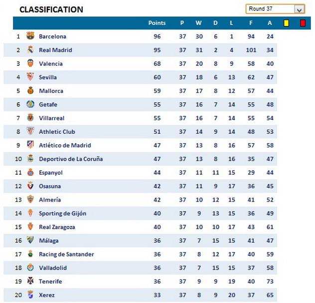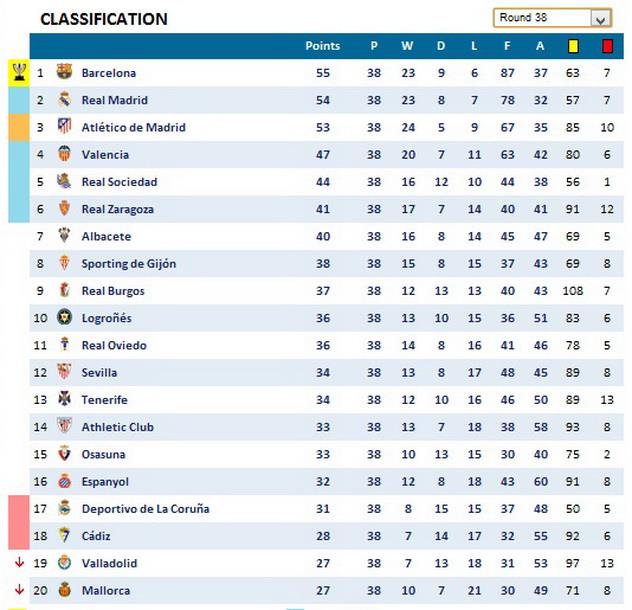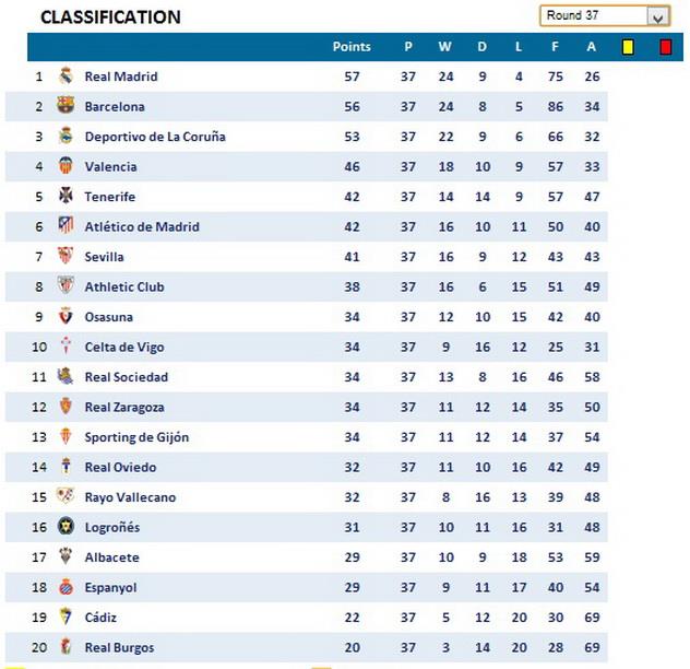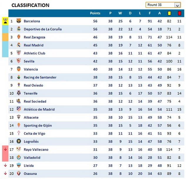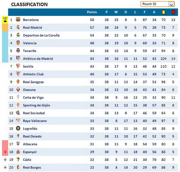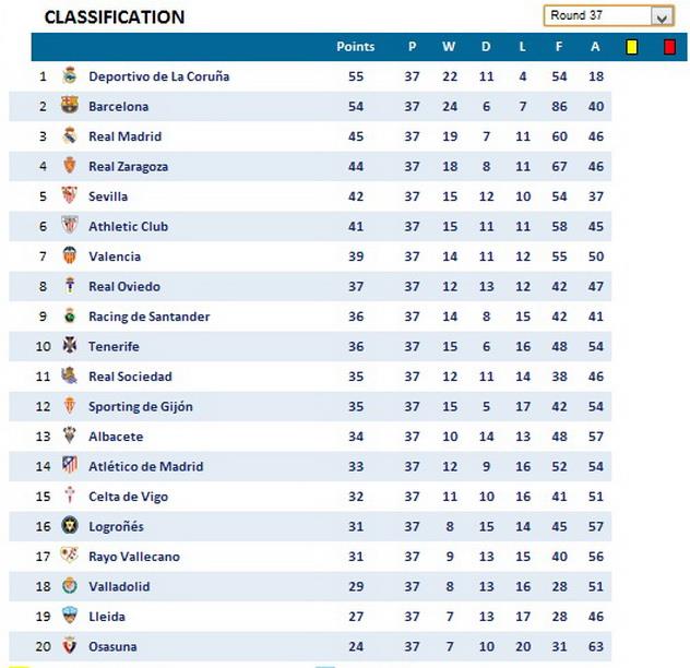 Тем не менее, перед последним туром в турнирной таблице сложилась привычная ситуация для Примеры последних лет: Депор шел первым, а ему в корму уперлась Барселона, отстававшая на пункт.