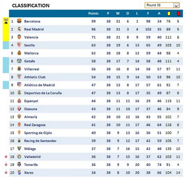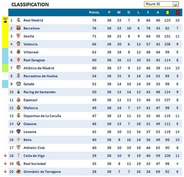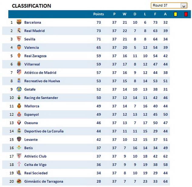 Мадрид и Барса вровень подошли к заключительному этапу национального первенства. Барса имела лучшую разницу забитых и пропущенных мячей, зато коллектив Фабио Капелло лучше провел очные Эль Класико (2:0 и 3:3).