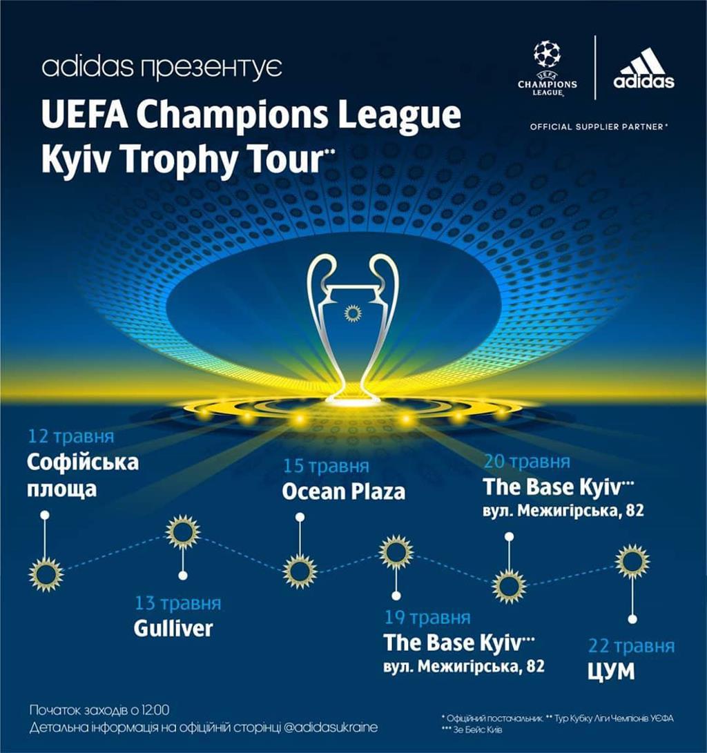 12 мая трофей выставят на Софийской Площади, на следующий день 13 мая в ТРЦ Gulliver. 15 мая кубок переедет в Ocean Plaza, а 19 и 20 мая будет красоваться на специально созданном adidas пространстве под названием The Base Kyiv. 22 мая трофей будет представлен в магазине adidas в ЦУМе.