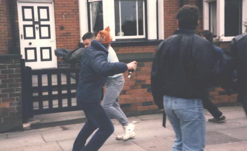 На стадионе Дева (пятитысячник, принадлежавший клубу Честер Сити, который, увы, подвергся расформированию в 2010 году) парни из «Моба Бенни» в количестве двухсот человек осуществили прорыв на газон, чтобы пересечь его и атаковать хозяйский сектор. Полиция бдила, и старалась задержать хулиганов, в результате чего на поле завязалась драка (что показательно, судья тоже пострадал): противостоящих копов Benny’sMobподверг артобстрелу с использованием кирпичей и битых бутылок.