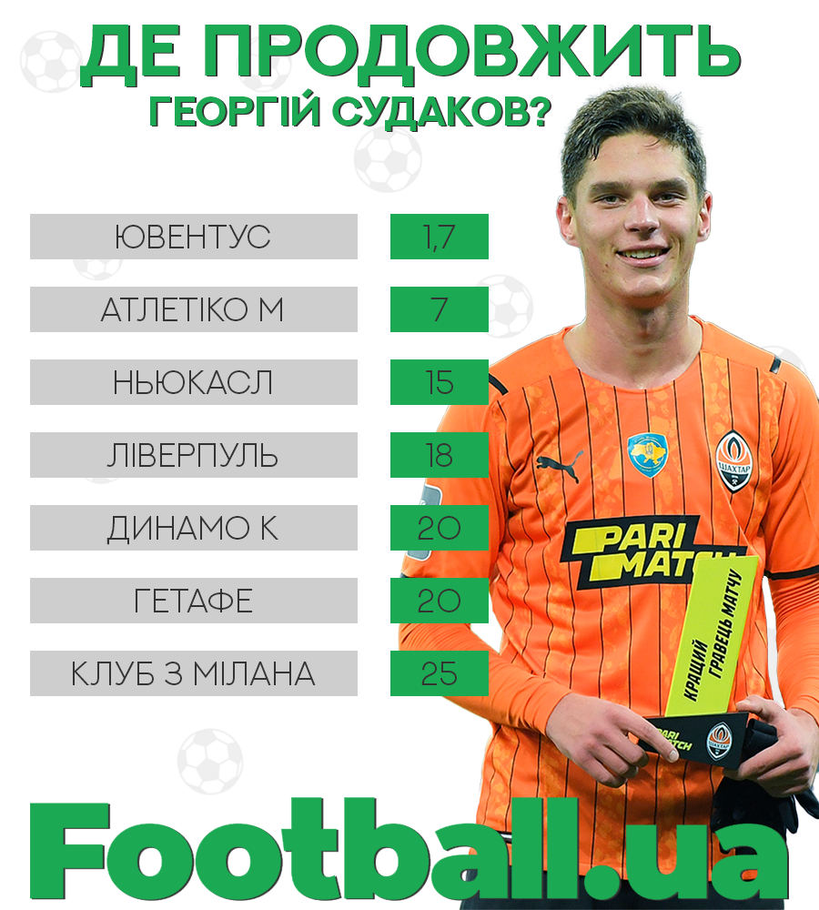 Ще одним можливим варіантом продовження кар'єри Судакова є англійська Прем'єр-ліга, де головними фаворитами на українця виглядають Ньюкасл (15) та Ліверпуль (18).