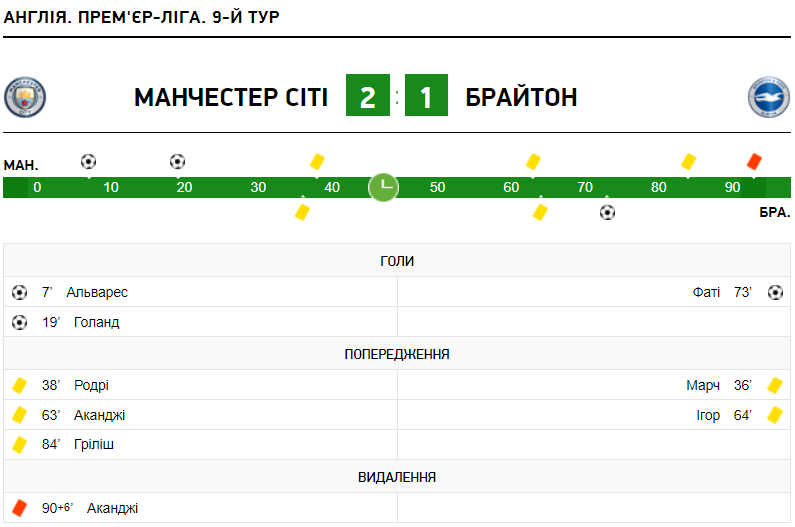 У рамках матчу дев’ятого туру англійської Прем’єр-ліги Манчестер Сіті на власному полі обіграв Брайтон (2:1).