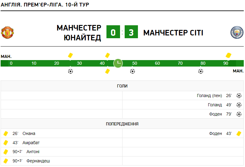 У рамках матчу десятого туру англійської Прем'єр-ліги Манчестер Сіті на Олд Траффорд обіграв Манчестер Юнайтед (3:0).