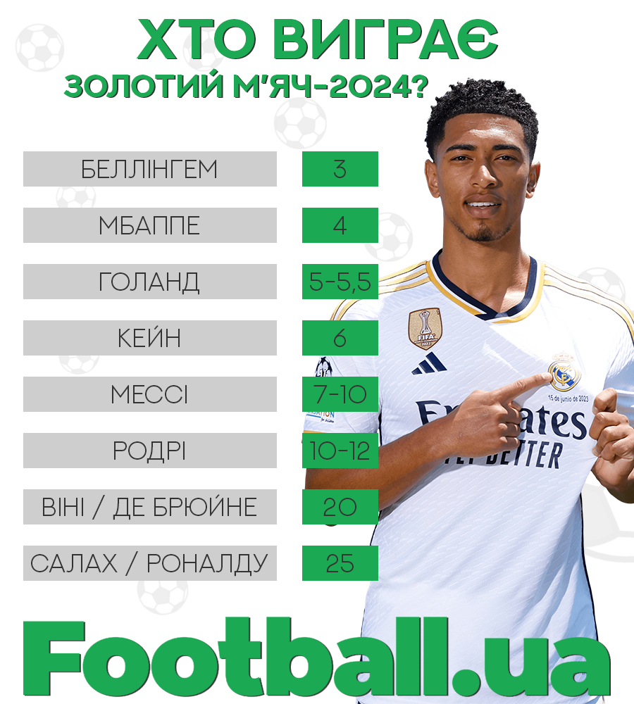 Отже, фаворитом на цей час вважається півзахисник Реала Джуд Беллінгем, який дивовижним чином розпочав сезон, забиваючи майже в кожному матчі. Коефіцієнт на його перемогу — 3.