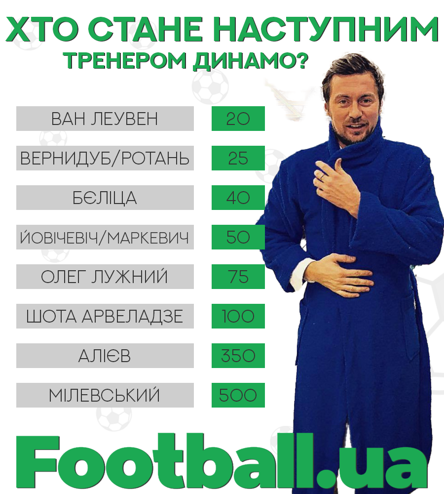 Патрік Ван Леувен нещодавно покинув Шахтар, але букмекери допускають, що він може піти стопами Луческу та очолити киян. Коефіцієнт на це — 20. Показником 25 були оцінені шанси двох тренерів УПЛ — Юрія Вернідуба та Руслана Ротаня. В списку є й колишній наставник Динамо З Ненад Белиця з коефіцієнтом 40.