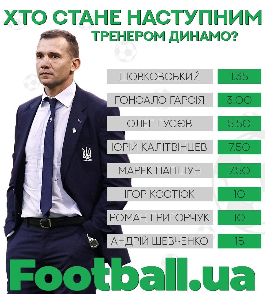 В деяких клубах при звільненні головного тренера довіряються тим, хто керую молодіжною командою. Ігор Костюк працював за великою кількістю гравців складу дорослої команди та виглядає цікавим варіантом. На його призначення пропонується коефіцієнт 10. Так само оцінили шанси Романа Григорчука, а, увага, Андрія Шевченка — показником 15. Чекаємо на величне повернення?