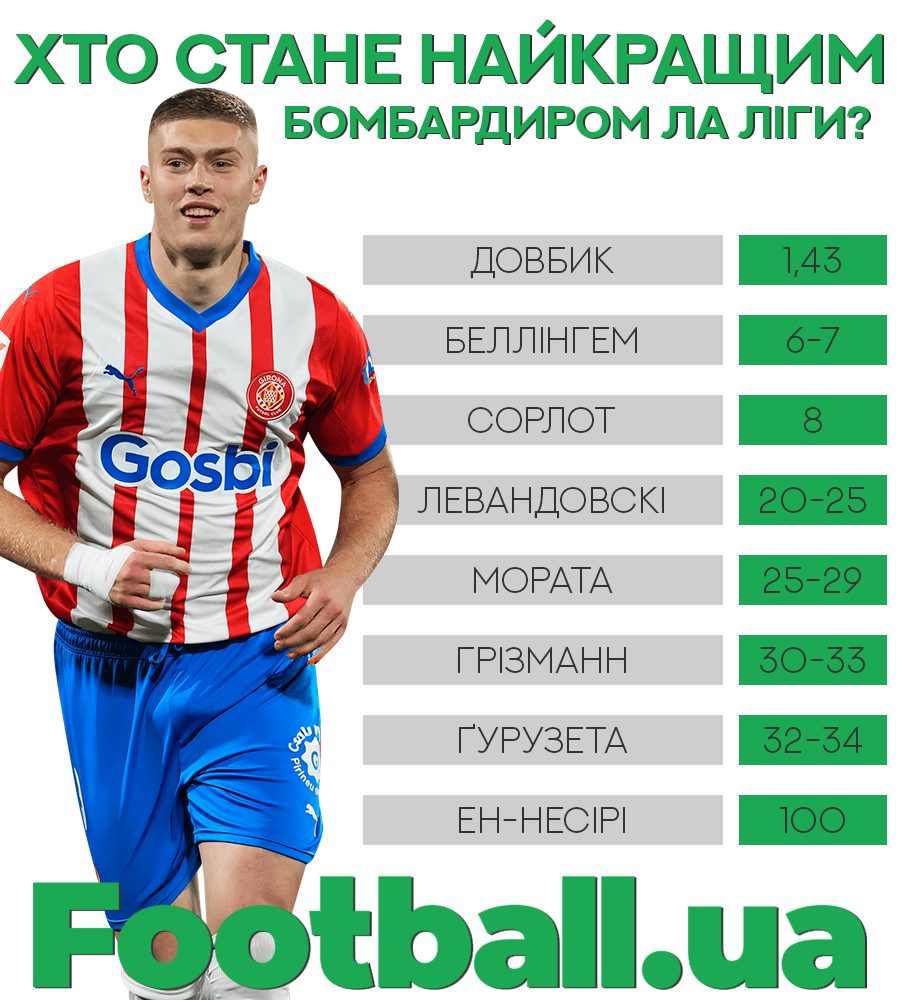 Наразі в українця 19 забитих м'ячів, а його найближчі переслідувачі — Александер Сорлот (Вільярреал) та Джуд Беллінгем (Реал) — мають по 17 голів. Далі йдуть: