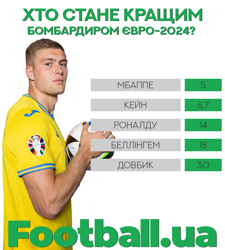 Знайшлось місце в рейтингу й для найкращого бомбардира чемпіонату Іспанії — нашому Артему Довбику. На нього можна поставити з коефіцієнтом 30.