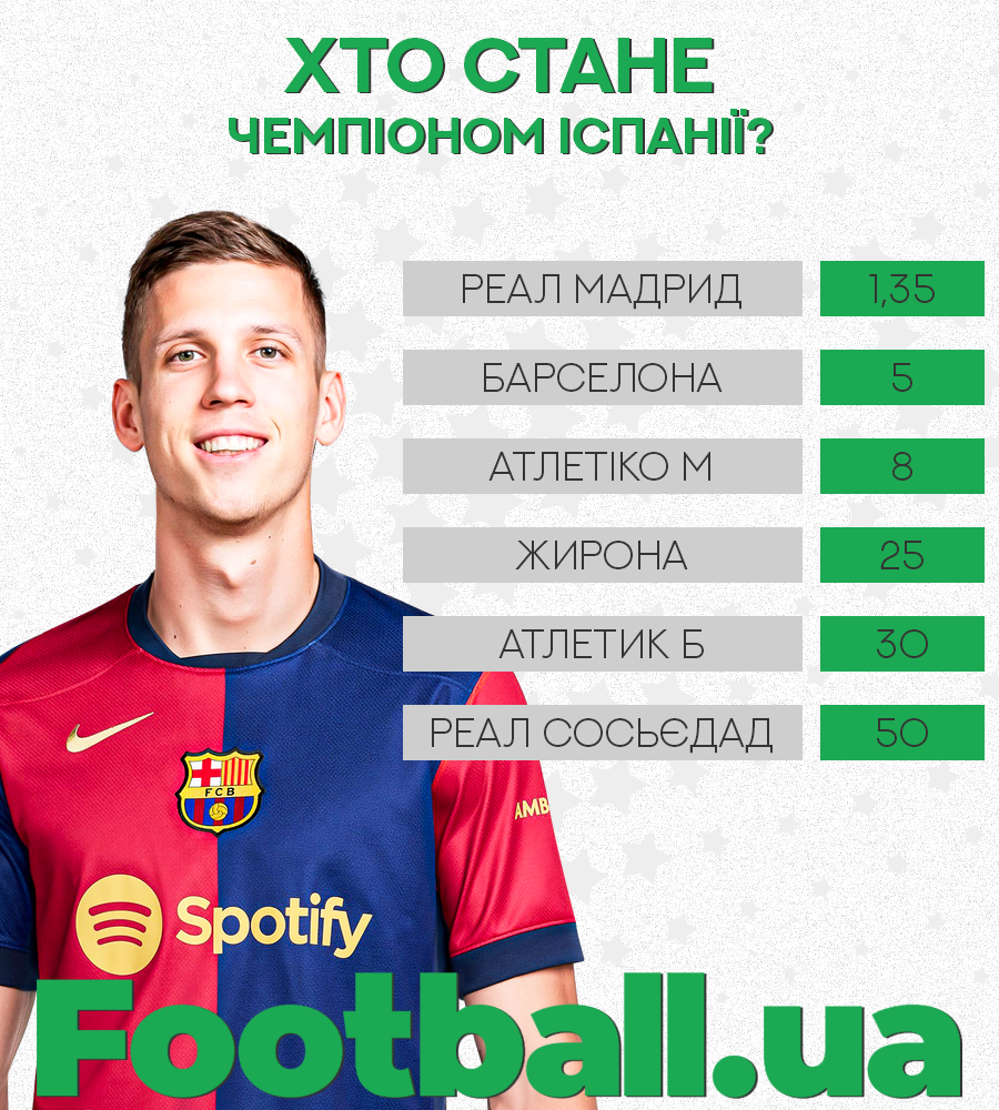 Далі експерти віддають перевагу Жироні, яка навіть без Артема Довбика має боротися як мінімум за Лігу чемпіонів (коефіцієнт 25), та Атлетику з Більбао (30). На Реал Сосьєдад віддають коефіцієнт 50.