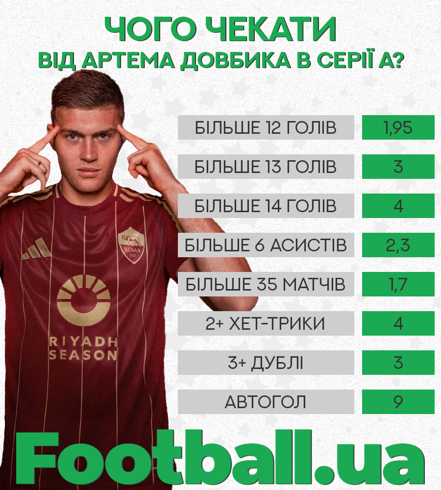 Букмекери вважають, що Артему цілком під силу забити 11-12 голів. На індивідуальний тотал більше 12 пропонується коефіцієнт 1,95, на 13 — 3, на 14 — 4.