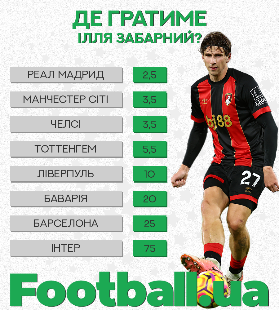 З так званої топ-6 команд АПЛ претендентом на українця не вважається тільки Манчестер Юнайтед, тоді як Тоттенгем та Ліверпуль з рахунків не скидають. Є певні шанси і на трансфер в Баварію чи Барселону, а ось в те, що Забарний переїде до Італії віри вже менше.