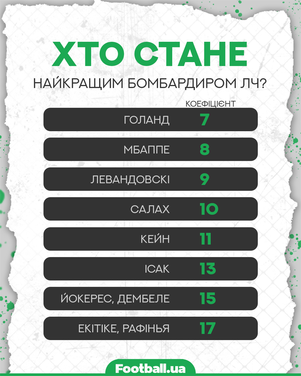 Фаворитом вважається нападник Манчестер Сіті Ерлінг Голанд. На його перемогу пропонується коефіцієнт 7. Його головним конкурентом буде Кіліан Мбаппе. Поставити на успіх французького форварда можна з котируванням 8. Замикає трійку лідерів страйкер Барселони Роберт Левандовські — на його бомбардирську звитягу пропонується показник 9.