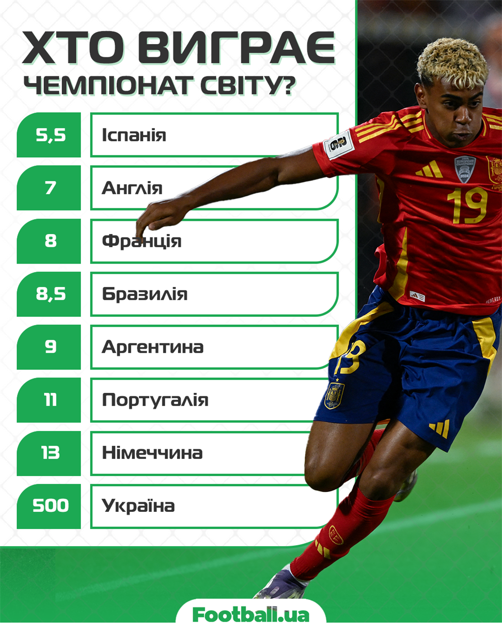 Збірна України ще повинна завоювати собі право грати на ЧС-2026, але вже зараз букмекери приймають ставки на їхнє чемпіонство з коефіцієнтом 500.